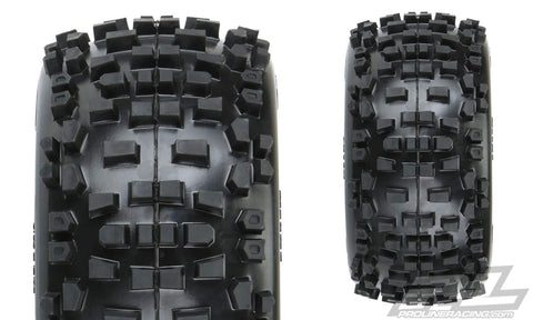 his is a pair of pre-mounted Badlands 3.8" All Terrain Tires. Are you ready to tackle any terrain? If so, then the Badlands tires are the answer for you! The Badlands tires offer motocross style tread that is perfect for adrenaline pumping Monster Truck and Truggy bashing. The Badlands tread is made strictly for the motocrosser in you. Its oversized grass and dirt shredding lugs offer you the ultimate in performance under all-terrain type conditions.The Badlands 3.8" tires now come Pre-Mounted on the next generation 3.8" wheel design from Pro-Line, the Raid 3.8" Removable Hex Wheel! Imagine being able to replace a damaged wheel hex without needing to replace your glued tires! These new Raid 3.8" wheels make this possible by using a unique 8x32 interlocking hex design that is secured to the wheel by 8 M3 screws that are spaced 32mm across. The hexes are included and are also available separately (6345-00). The built-in adjustability and ease of use make this a new must-have wheel for bashers everywhere! Be the first to own the latest and greatest technology from Pro- Line, get the new pre-mounted Badlands 3.8" tires now!Tire Features:Readers' Choice Award Winning Tread DesignAggressive Tire DesignTire Based on Motocross Tread TechnologyLarge Tire Lugs for the Ultimate in Tire DurabilityMade in the USA, since 1982 Read about Pro-Line Racing's HistoryWheel Features:Removable Hexes Allow you to Easily Replace Damaged Hexes17mm Wide Offset 8x32 Hexes are IncludedWheel Made from High-strength, Durable DuPont Nylon MaterialRaid 10-spoke Wheel Design Mimics Full-size Racing WheelsM3 Wheel Hex Hardware IncludedPre-Mounted Badlands 3.8" Tires on Raid Black 8x32 Removable Hex Wheels (2 pcs)8x32 to 17mm 1/2" Offset Hex Adapters (2 pcs)M3 x 12mm long SHCS hardware (16 pcs)Fits:E-REVO 2.0SUMMITTekno MT410ARRMA KratonOther Monster Trucks with 17mm Hexes