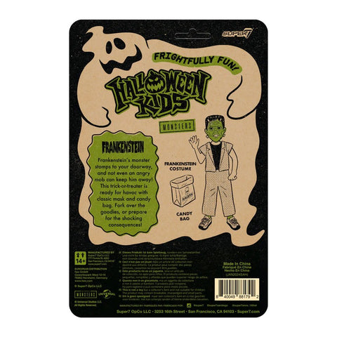 Warning! The monster is on the loose! This 3.75â scale, articulated Frankenstein Boy Halloween Kids ReAction Figure features a young trick-or-treater outfitted in a costume inspired by the classic Universal Monster and the vintage Halloween costumes from the â70s and â80s, and includes a candy bag accessory. You wonât need to be tricked into treating yourself to a trip down nostalgia lane with this Frankenstein Boy Halloween Kids ReAction Figure!