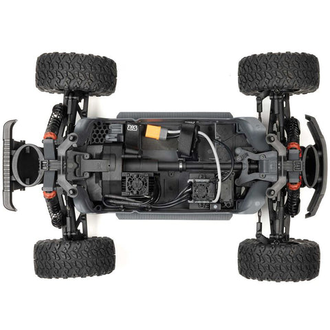 Factory assembled and installed, the heavy-duty, metal gear differentials send power from the Spektrum 3100Kv brushless motor to all four wheels for worry-free bashing on dirt, gravel, or short grass. The entire power system is well-protected and the all-terrain independent suspension and oil-filled shocks soak up bumps. Set up ramps or build some dirt mounds and launch your truck into the air! Extended height side guards on the strong composite chassis combine with the close-fitting body to keep dirt and debris out of the chassis tub. When maintenance is needed, the hidden clipless body retention system allows quick, easy chassis access.