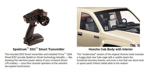 With the included Spektrum DX3 radio, you'll enjoy the superior range, response, and interference resistance of exclusive DSMR technology. Together with the installed Firma Crawler 120A Smart Sensored-Brushless ESC, it also comes ready to deliver the telemetry advantages of exclusive Spektrum Smart technology. Install a Spektrum Smart LiPo battery and you can view vehicle battery capacity on the transmitter's voltage level indicator. Outfit the DX3 with the optional BT2000 Bluetooth module, download the free Spektrum Dashboard app to your smart device, and you're ready to use more real-time Smart telemetry without needing onboard sensors or modules.
