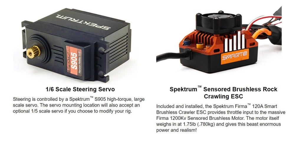 - Includes a powerful Spektrum S905 high-torque, large-scale steering servo (also accepts larger 1/5 scale servos with the included adapter)
