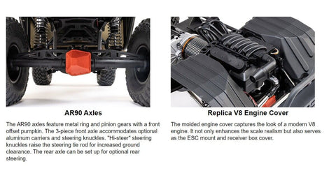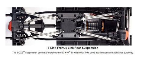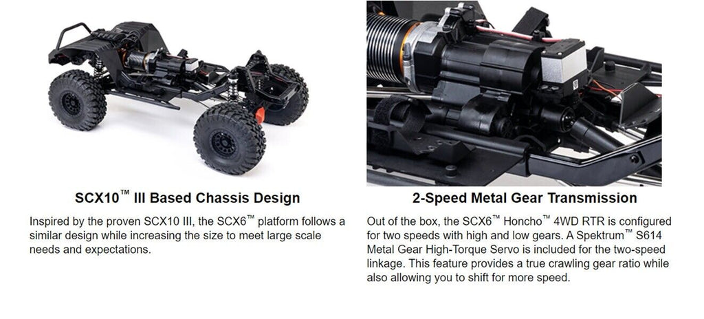 The SCX6 Honcho is engineered for extreme durability and performance, as shown by its AR90 axles with metal ring and pinion gears and front offset pumpkin. For optimal handling, the chassis has a three-link front and four-link rear suspension setup and metal links are used at all suspension points. The transmission offers high and low gears out of the box, with a Spektrum S614 metal gear high-torque servo included and installed for the two-speed linkage.