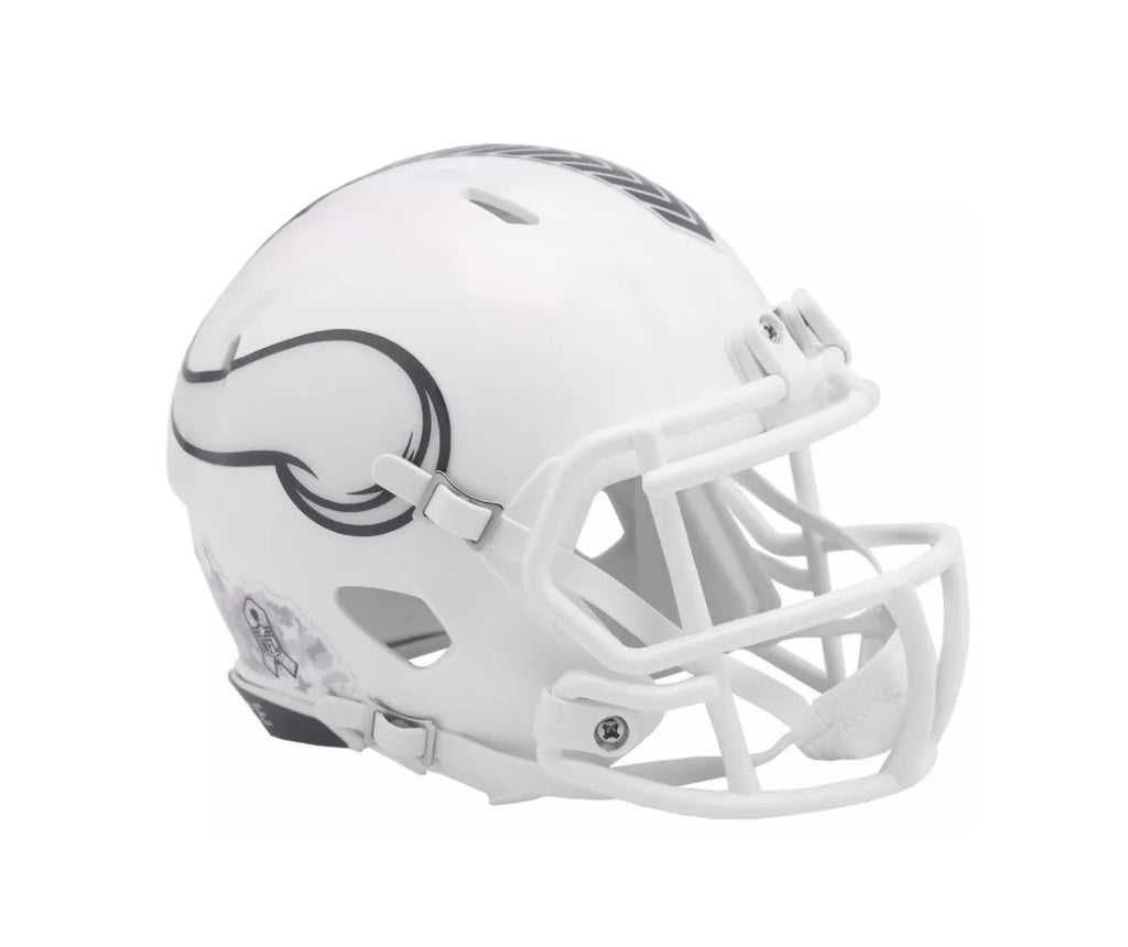 Minnesota Vikings 2024 Salute To Service Alternate Riddell Speed Mini Helmet New in Box. Features a military-inspired color scheme, complete with an American flag and Salute To Service ribbon on the rear. The striking team graphics printed on the sides will add some much-needed spirit to your collection.